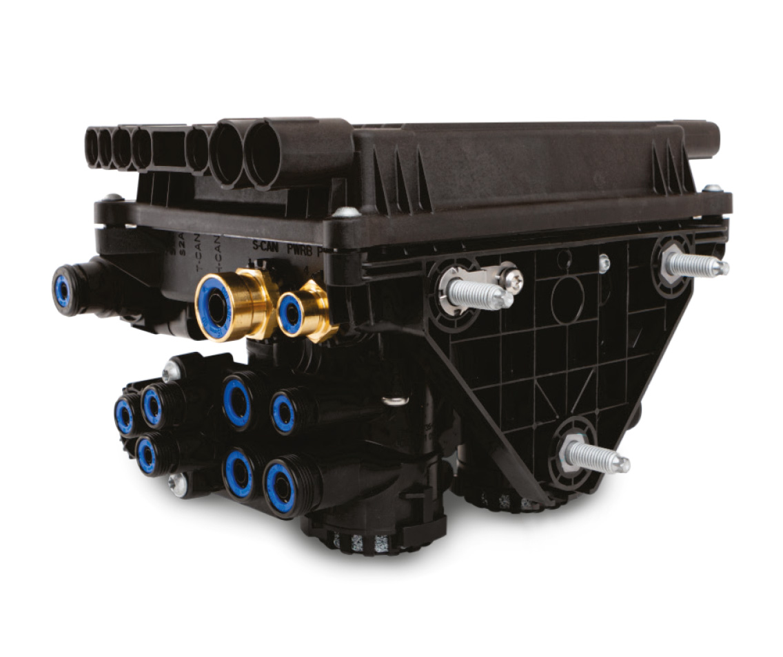 Ebenfalls mit dem ersten Platz ausgezeichnet wurde das innovative elektropneumatische Bremssteuerungsmodul welches als «Schaltzentrale» im Bremssystem für LKW-Anhänger eingesetzt wird und dort alle sicherheitsrelevanten Bremsfunktionen steuert. Das Bremssteuerungsmodul von Haldex Brake Products Ltd ist für einen Betriebsdruck von bis zu 10 bar bei -40°C bis 80°C ausgelegt. Der Modulträger aus Grivory HT1 ist im Betrieb hohen Schwingungen ausgesetzt und wird mittels drei Befestigungspunkten am Anhänger befestigt. Der Ventilkörper und die Zusatz-/Modul-komponenten aus Grivory HT1 haben im Dichtbereich hohe Rauigkeitsanforderungen damit der Verschleiss von Dichtungen reduziert werden kann. Das Steuermodul der Federspeicherbremse (SBCV «Spring Brake Control Valve») besteht fast vollständig aus EMS-Materialen. Die Abdeckung aus Grivory HT1 wird an den Verteiler geschweisst. Das SBCV wird durch einen Hauptkolben aus Grivory TSG und einen Nebenkolben aus Grilamid 2D betrieben. Die Rückschlagventilhalterung des SBCV besteht aus verstärktem Grilon TSS und ist mit Schnapphaken zur schnellen Montage bzw. Demontage versehen. Entscheidend für den Einsatz der verschiedenen EMS-Materialien war die zuverlässige Funktionsweise der sicherheitsrelevanten Komponenten während der Langzeit-Erprobungsphase.