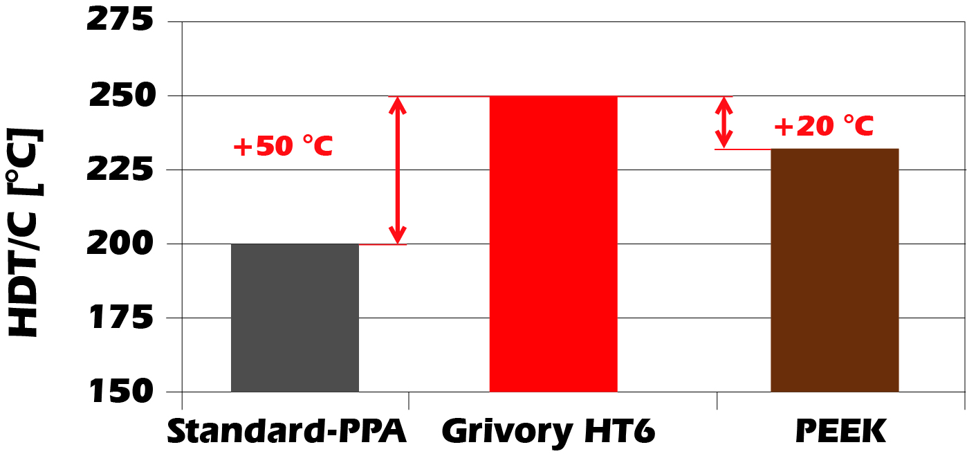 1994 lancierte EMS-GRIVORY die Markteinführung des Hochtemperaturwerkstoffs Grivory HT. Mit diesem bewährten Produkt ist EMS-GRIVORY zum Marktführer in Europa geworden und bietet weltweit das breiteste PPA-Produktportfolio an. Mit Grivory HT6 brachte EMS-GRIVORY eine neue Grivory HT-Produktelinie mit deutlich erhöhter Temperaturperformance auf den Markt.