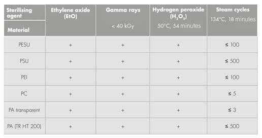 Der Grad der Wiederverwendbarkeit von medizinischen Geräten und Instrumenten entscheidet über die Auswahl des Kunststoffes. Werden die genannten Kunststoffe maximal fünfmal sterilisiert, so sind alle in «Abb. 2» genannten Produkte geeignet. Für die mehrfache Sterilisation (≤ 500 Zyklen) eigenen sich PSU und TR HT 200, wobei das TR HT 200 eine bessere Transparenz aufweist, deutlich duktiler und einfacher zu verarbeiten ist. Bauteile aus PC weisen eine ähnliche Transparenz wie TR HT 200 aus, sind jedoch nur bedingt dampfsterilisierbar (≤ 5 Zyklen).
