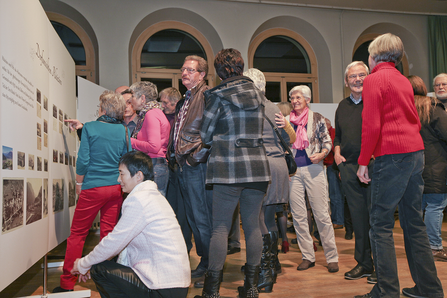 In seiner kurzen Ansprache bedankte sich Herbert Bonorand, Rhäzünser Gemeindepräsident, für das aussergewöhnliche Geschenk. Auf einer 12 Meter langen Wand zeigt die Ausstellung rund 90 historische Postkarten von Rhäzüns und seinem Schloss aus verschiedensten Perspektiven: Rhäzüns mit der Albulalinie, der Luftseilbahn Rhäzüns / Feldis, dem Rheinverlauf, der Kirche Sogn Gieri sowie Schloss und Dorf.