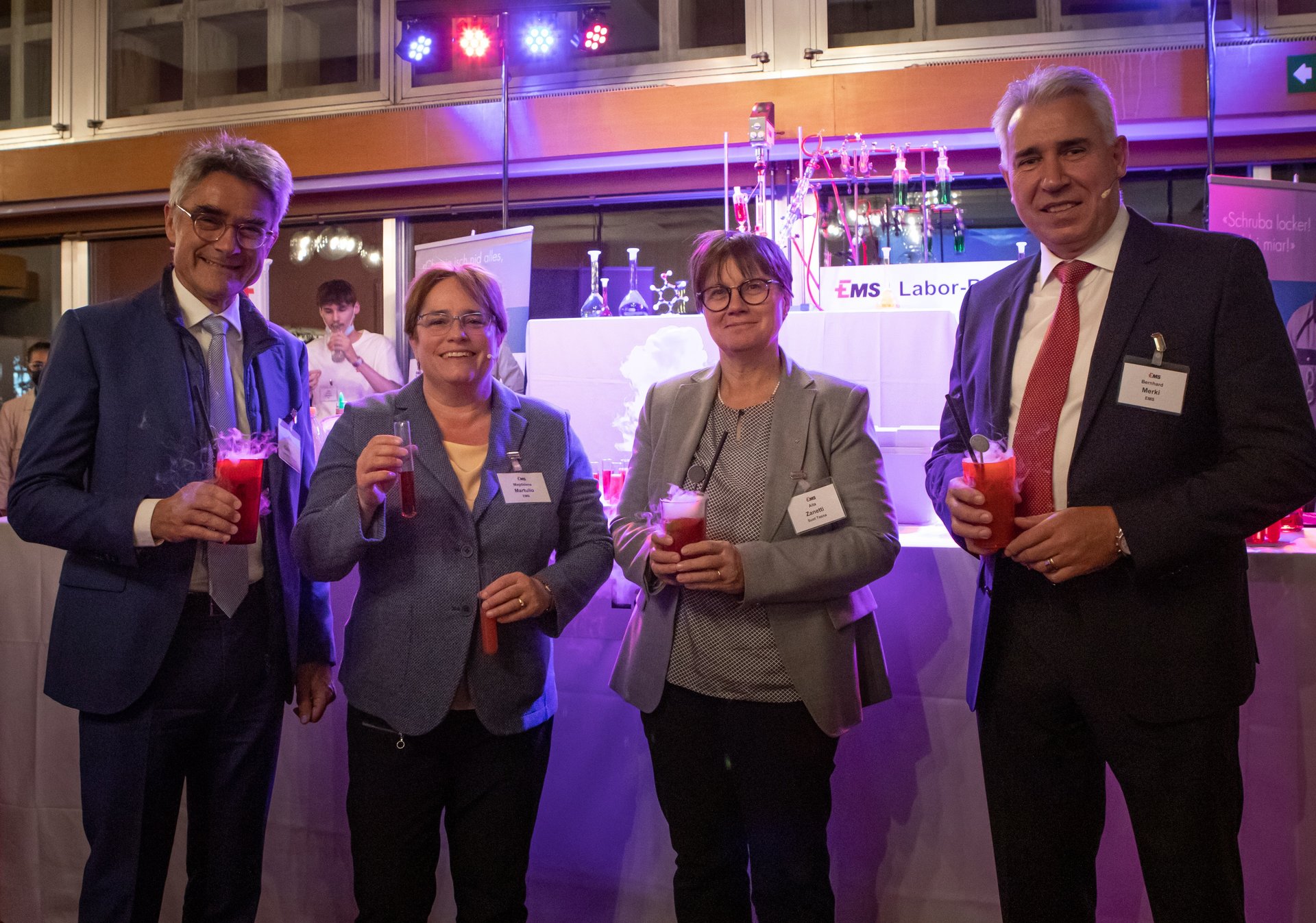 Am vergangenen Dienstagabend besuchten der Grosse Rat und die komplette Regierung des Kantons Graubünden die EMS-CHEMIE in Domat/Ems. EMS-Unternehmerin und Bündner Nationalrätin Magdalena Martullo und Verwaltungsratspräsident Bernhard Merki begrüssten persönlich zum traditionellen Stelldichein. Nach einer Stärkung mit geheimnisvollen "MINT-Drinks" der EMS-Lernenden erhielten die Gäste einen Einblick in die hohe Innovationskraft und beeindruckenden Investitionspläne der grössten Bündner Steuerzahlerin. Beim lebhaften Nachtessen nutzten Gastgeber und Gäste die Möglichkeiten zum regen Austausch und zur Beziehungspflege.