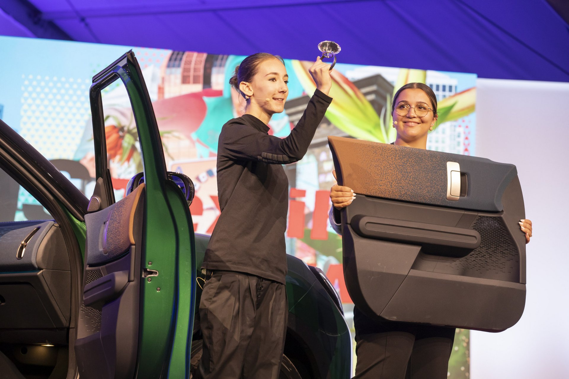 In einer spektakulären Fashion-Show wurde eine breite Palette von Textilanwendungen mit EMS-Spezialklebegarnen präsentiert. Diese ermöglichen nun auch flachgestrickte Interieur-Oberflächen im Auto – am Armaturenbrett, in den Türverkleidungen oder bei den Stauräumen in der Mittelkonsole. Die gestrickten Oberflächen können nahtlos in einem Stück, in jeder erdenklichen dreidimensionalen Ausgestaltung, in allen Farben und mit allen Strickmustern und ohne nachträgliches Zuschneiden und Vernähen hergestellt werden.