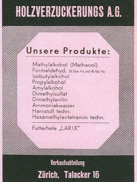 Start of ethyl alcohol production from local waste wood in Domat/Ems. By the end of the war, production from the HOVAG covered around 30% of the Swiss fuel requirements. With nearly 200 employees, HOVAG is by far the largest employer in the mountain Canton Grisons (CH).