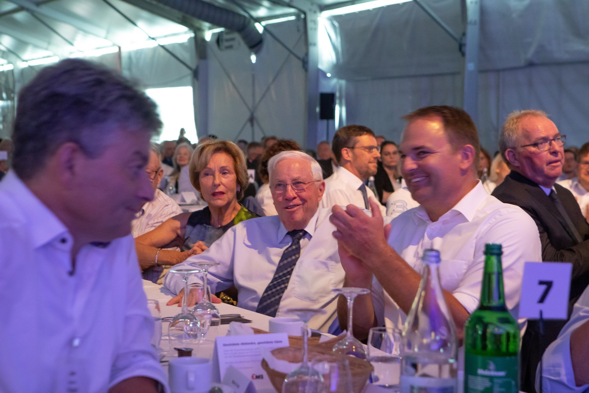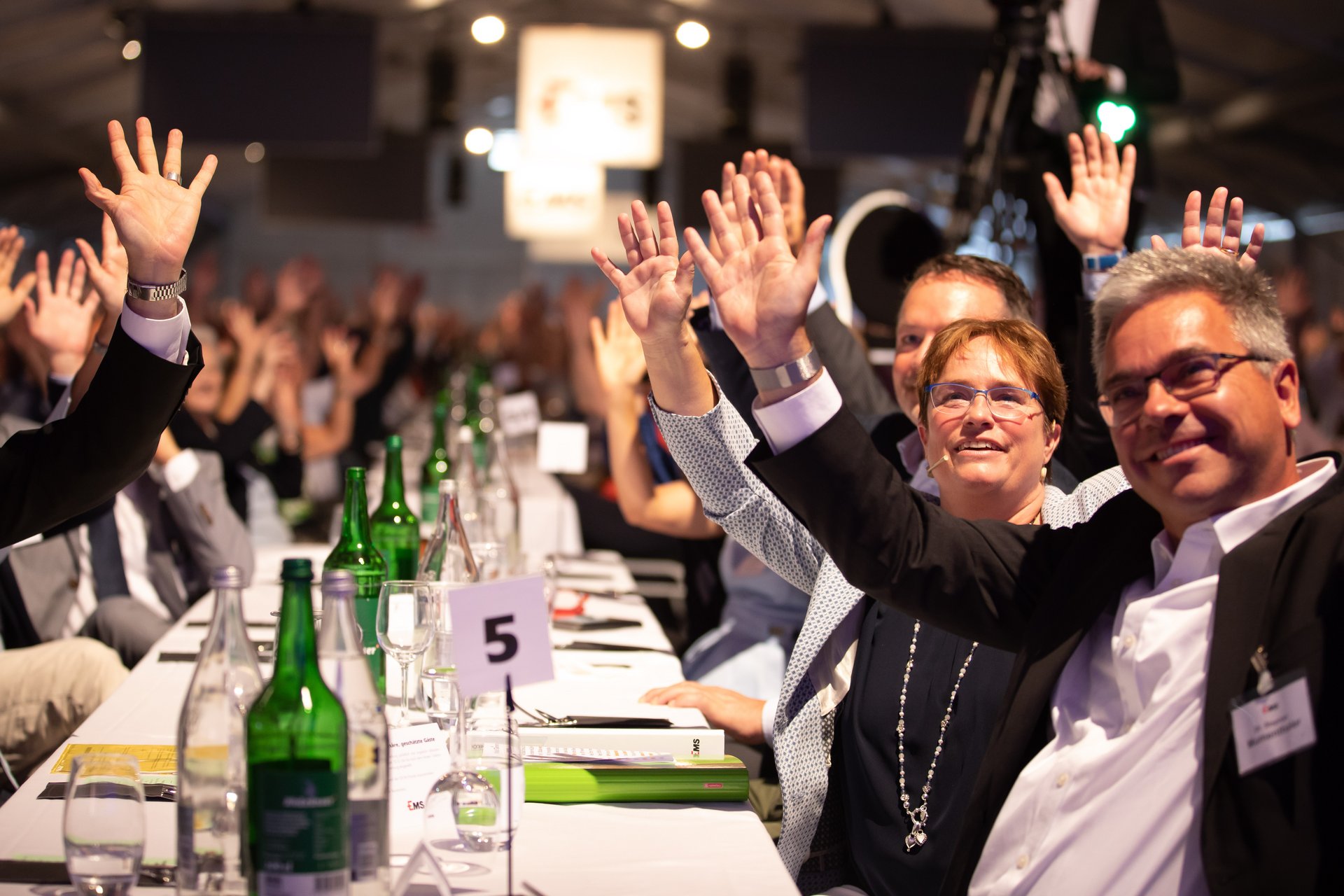 In the expansive marquee at the Domat/Ems production site, shareholders were again treated to a tasty lunch menu. 10 chefs from Toblers Event Catering AG, with 35 helpers from the Männerriege Tamins, the Ladies Gymnastics Club Trin and the Country Women's' Association Imboden, were responsible for preparation of 3,900 melon slices, 45 kg Grisons air-dried ham, 465 kg Mesolcina beef rolls, 250 kg cabbage turnip, 120 kg polenta and 240 kg chocolate mousse. The 3-course lunch was served to the 1,655 participants by 65 members of various local clubs.
