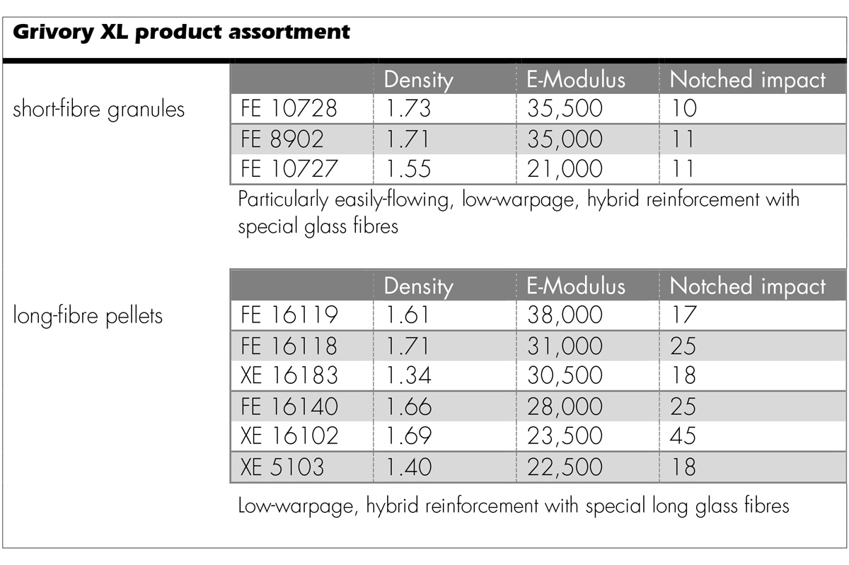 Grivory XL products encompass a large spectrum of specifically modifiable properties. These properties can be adjusted to correspond to the requirement catalogue in each case. Table 1 shows some of the various products although this is only a very small section of the possibilities available.
