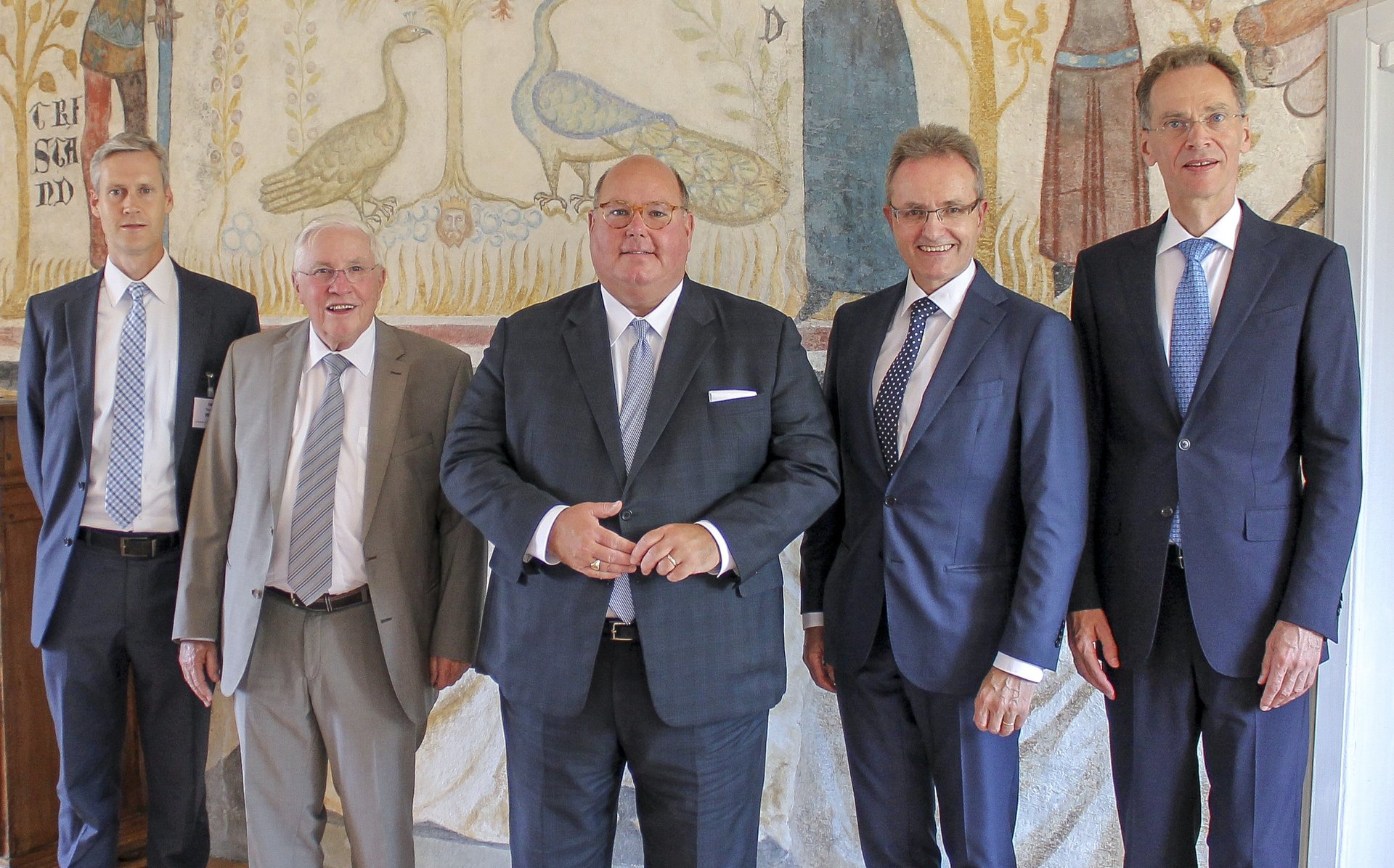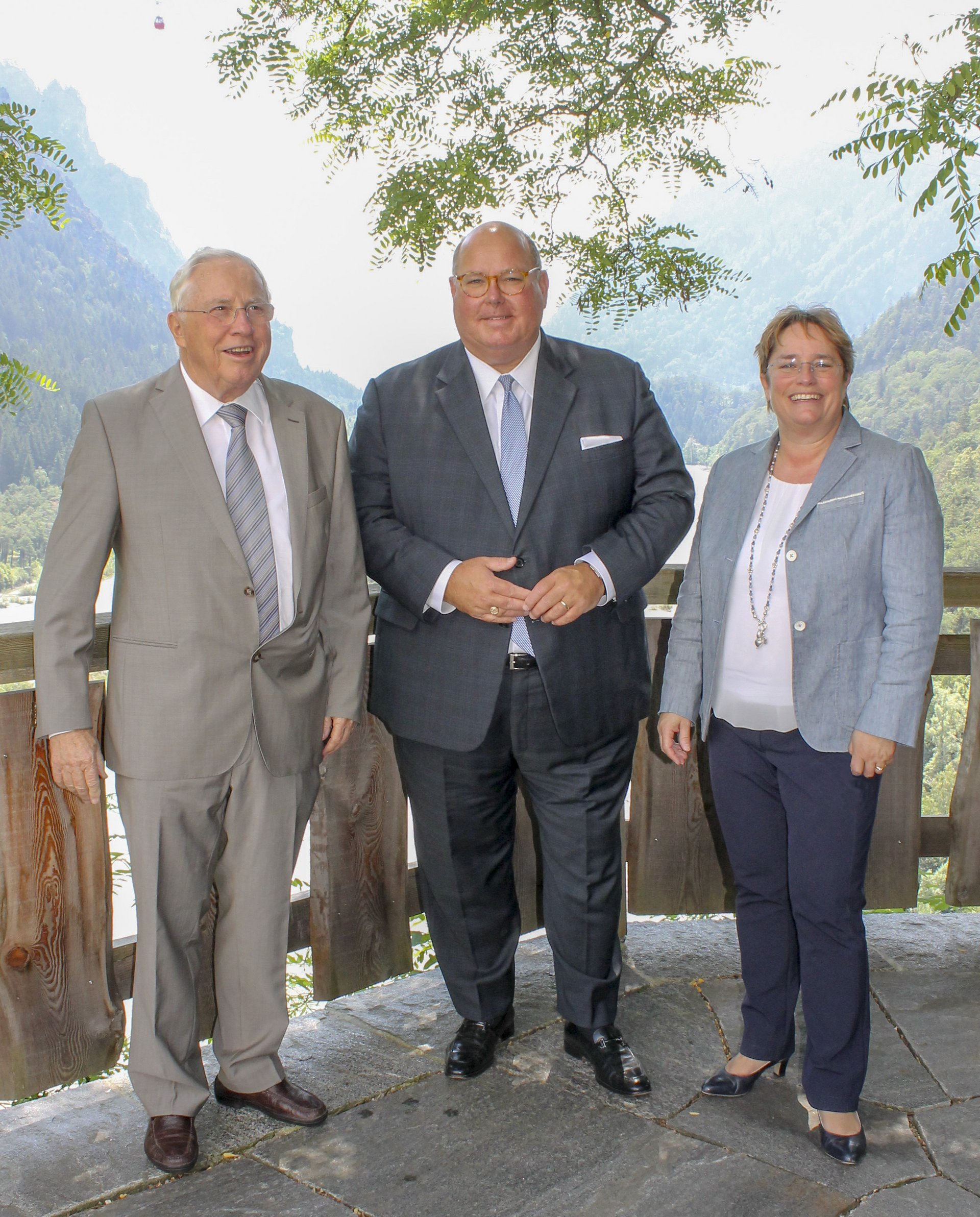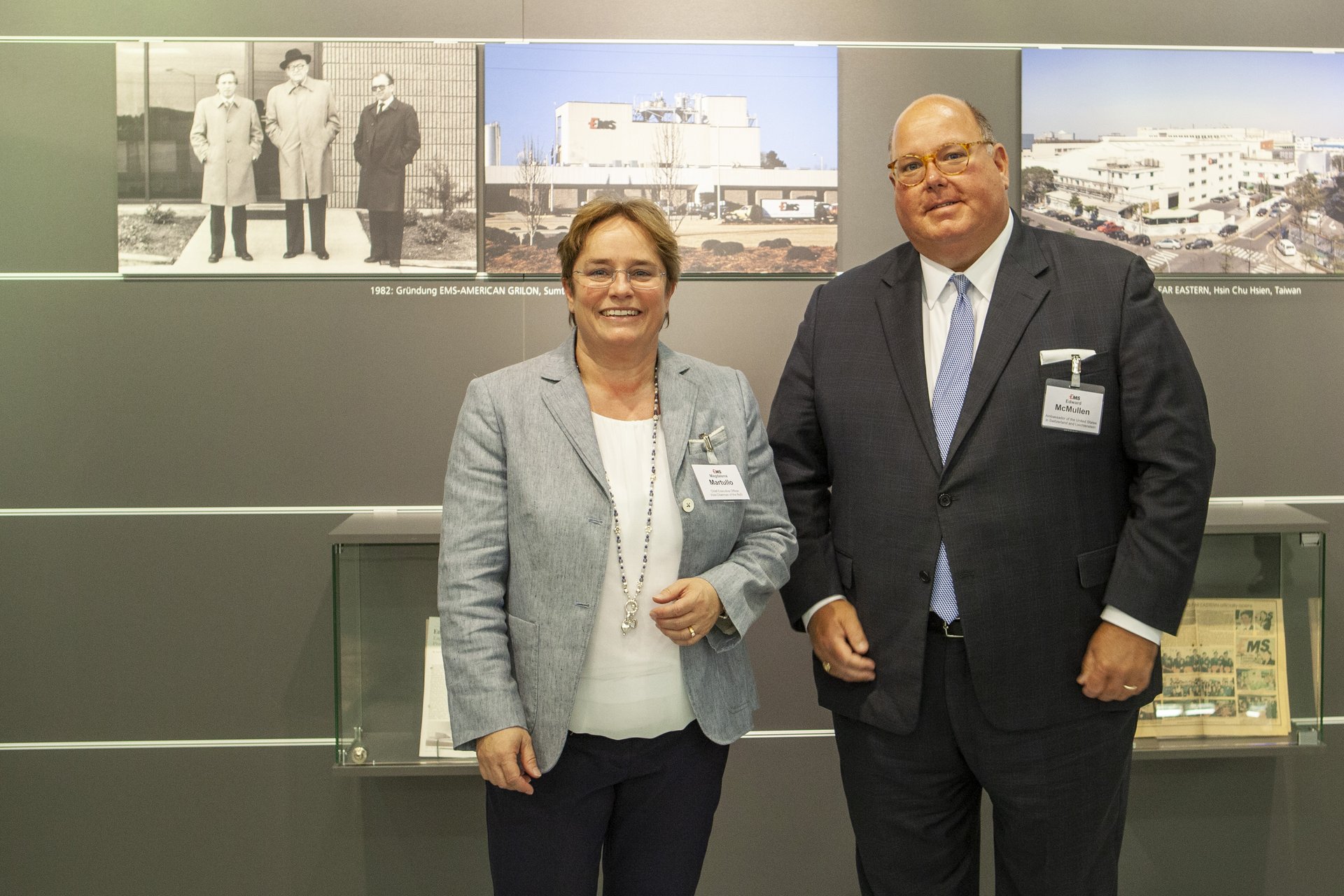 Edward McMullen, der Botschafter der USA in der Schweiz, besuchte am Dienstag, 9. Juli 2019 die EMS-CHEMIE in Domat/Ems. Nach einem Rundgang mit EMS-Chefin und Bündner Nationalrätin Magdalena Martullo-Blocher durch das Werk und die Ausstellung über die fast unglaubliche, 83-jährige Geschichte von EMS ging es weiter zum Mittagessen und einer Besichtigung auf Schloss Rhäzüns, wo auch Altbundesrat und Ehrenpatron Christoph Blocher dazustiess.